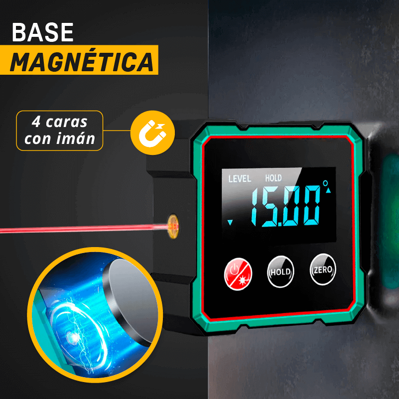La base magnética de 4 caras permite colocar nuestro inclinómetro en múltiples posiciones, adaptándose a diferentes superficies metálicas con estabilidad total. Ya sea en estructuras horizontales, verticales o en ángulo, el dispositivo se mantiene fijo sin deslizamientos. Esta versatilidad te permite trabajar con ambas manos libres, mejorando la precisión y la seguridad en cada tarea.