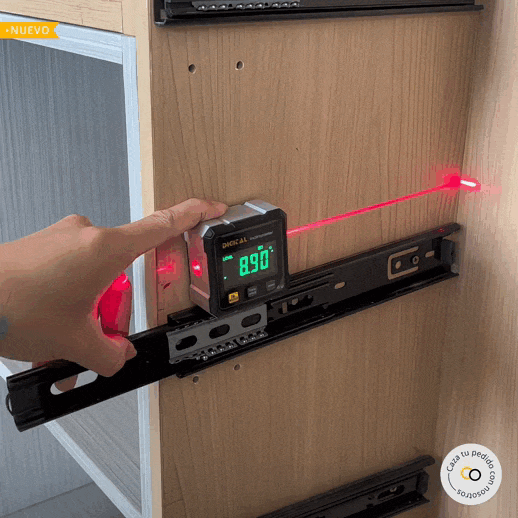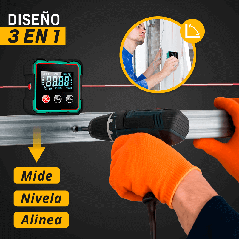 Nuestro inclinómetro multifuncional 3 en 1 integra nivel digital, medidor de ángulo y láser de línea en un diseño compacto y profesional. Gracias a sus dos líneas láser incorporadas, permite alinear con facilidad durante reformas o instalaciones. Ya no necesitas cargar con múltiples herramientas: mide, nivela y proyecta desde una misma herramienta. Una solución práctica, portátil y versátil para múltiples tareas.